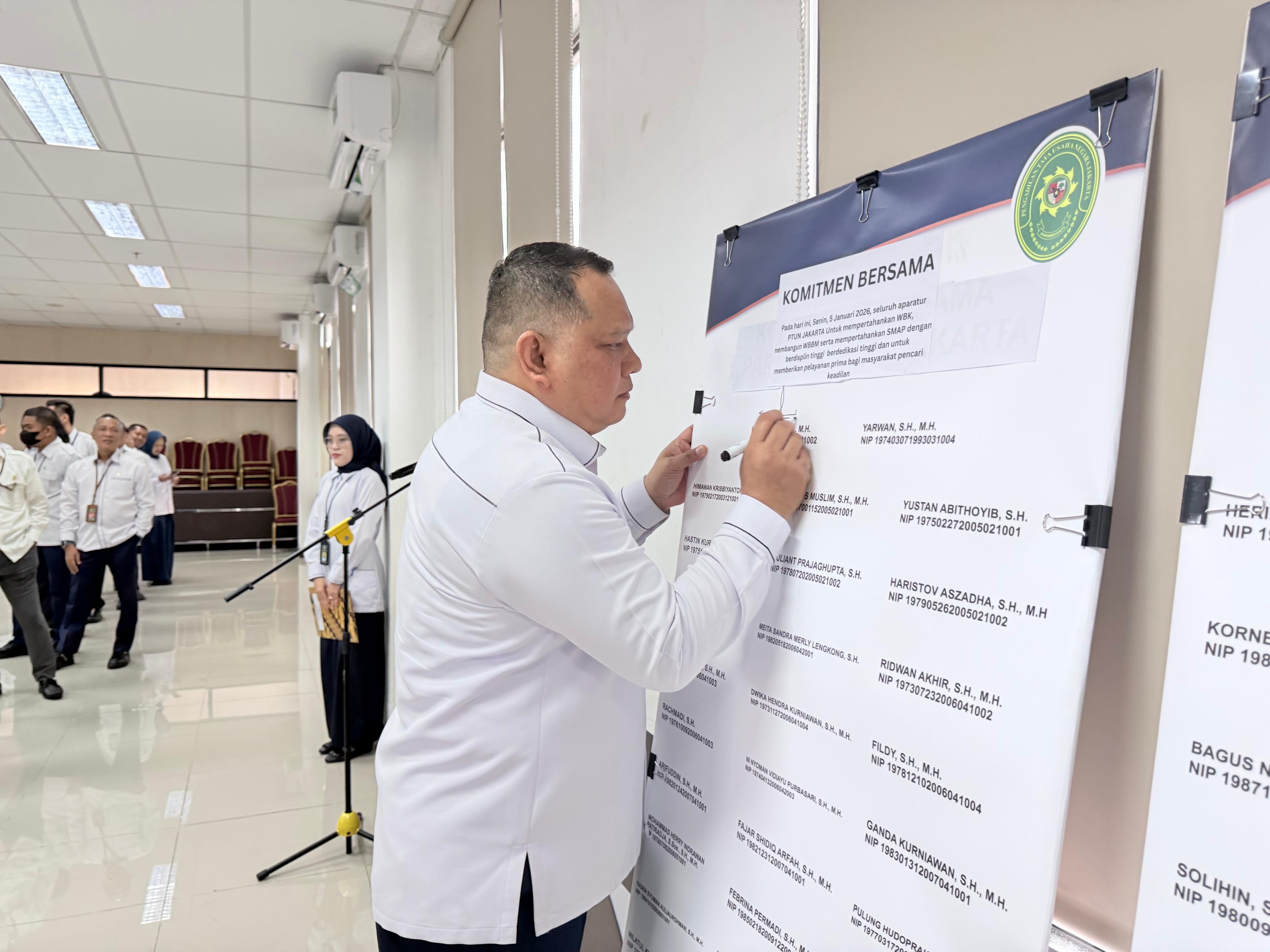 Jakarta, 05 Januari 2026 — Pengadilan Tata Usaha Negara Jakarta menyelenggarakan kegiatan Penandatanganan Pakta Integritas, Perjanjian Kinerja, dan Komitmen Bersama yang bertempat di Ruang Aula Lantai 4 PTUN Jakarta. Kegiatan ini diikuti oleh Ketua, Wakil Ketua, para Hakim, pejabat struktural dan fungsional, serta seluruh aparatur PTUN Jakarta.
