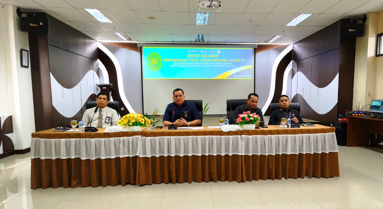 Pada hari Rabu, 29 Oktober 2025, Pengadilan Tata Usaha Negara (PTUN) Jakarta menyelenggarakan Rapat Bulanan untuk bulan Oktober bertempat di Ruang Aula Lantai 4. Kegiatan ini dihadiri oleh seluruh aparatur PTUN Jakarta, baik dari unsur pimpinan, hakim, pejabat struktural dan fungsional, hingga staf dan tenaga honorer.