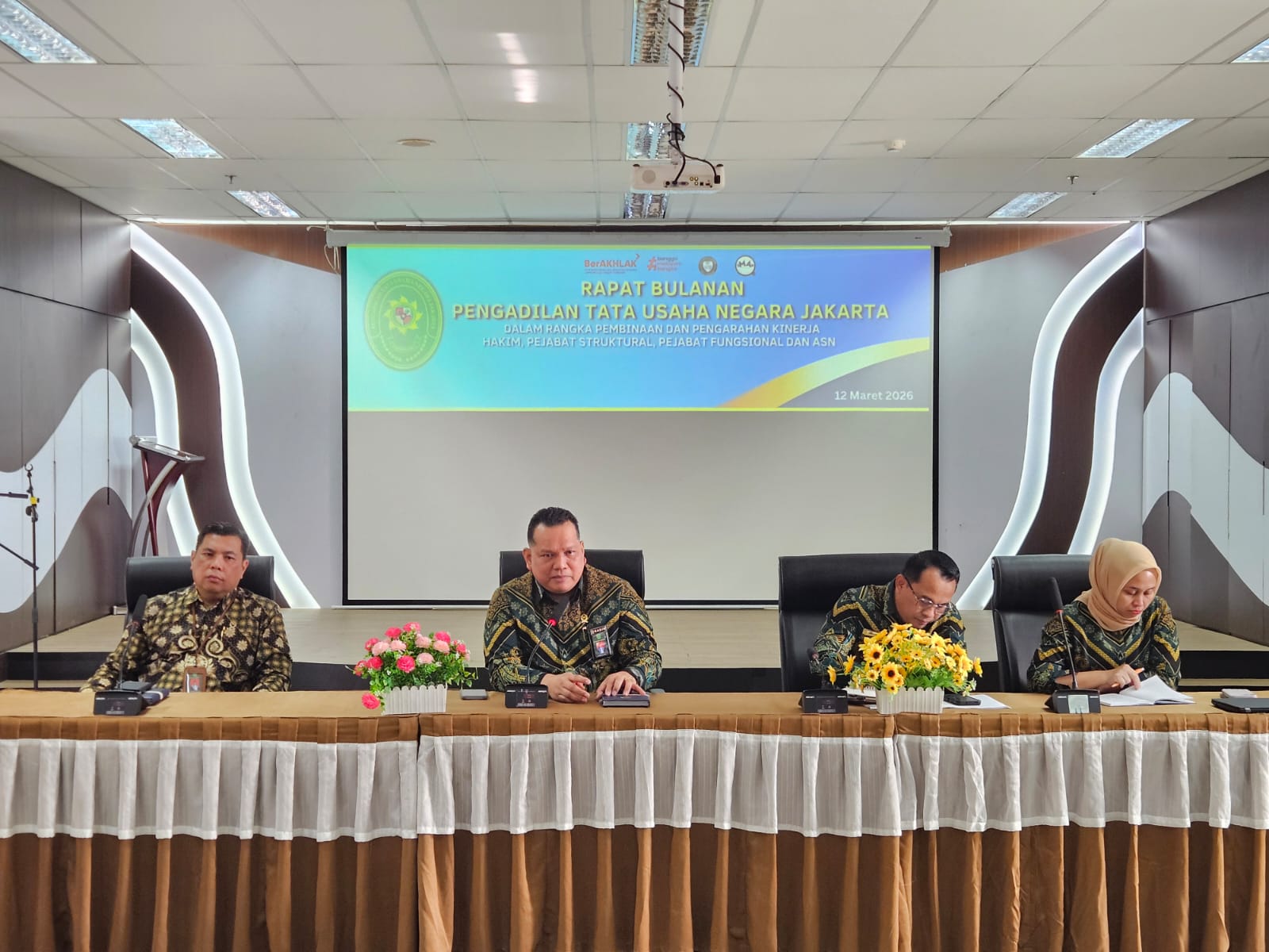 Pengadilan Tata Usaha Negara Jakarta (PTUN Jakarta) menyelenggarakan Rapat Bulanan Pembinaan dan Pengarahan Kinerja bagi Hakim, Pejabat Struktural, Pejabat Fungsional, serta Aparatur Sipil Negara pada Kamis, 12 Maret 2026. Kegiatan ini berlangsung di Aula Lantai 4 PTUN Jakarta dengan suasana yang penuh semangat dan kebersamaan.
